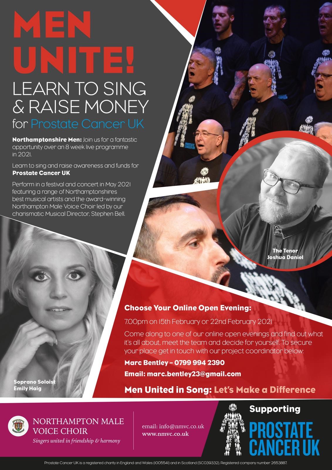 Northampton Male Voice Choir is challenging the men of Northamptonshire to join them and the wonderful soprano, Emily Haig and ‘The Tenor’ Joshua Daniel in a concert in Northampton to raise money for Prostate Cancer UK.